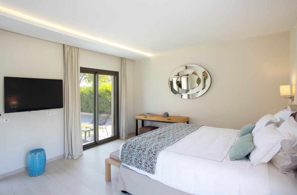 Internally the villa has a spacious minimal living room and a fully equipped kitchen where private chefs can make you their beautiful creations. Regarding the rooms in the main building there are a double bedroom with en-suite bathroom and king-size bed overlooking the sea and a suite at the top with its own terrace and sun loungers. The guest studio offers the third bedroom of the accommodation with en-suite bathroom, independent entrance and access to the beautifully landscaped garden of the villa.