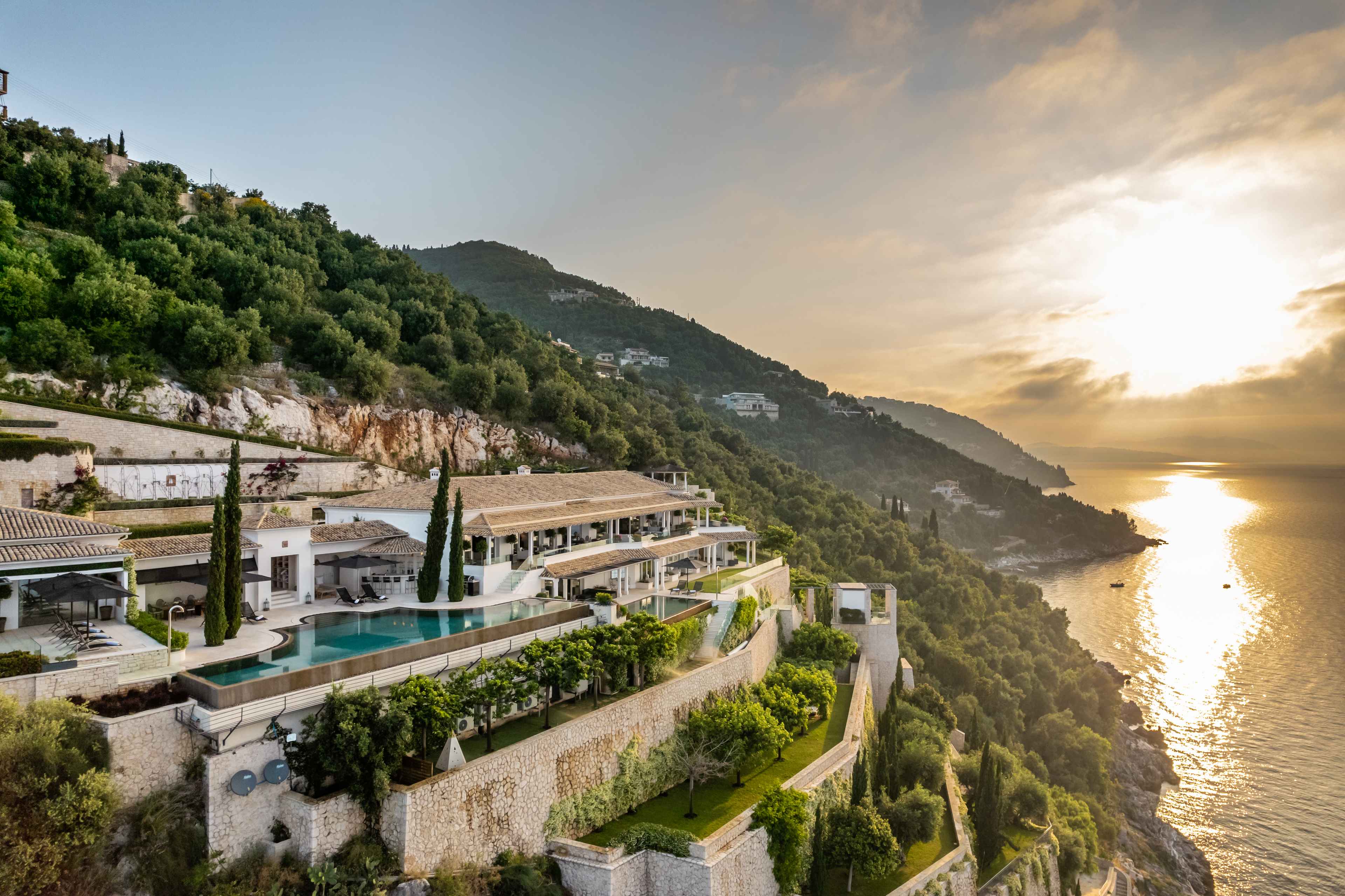 A paradise of privacy and majestic aura is located on the slopes of Nissaki of Corfu. With fantastic views of the Ionian Sea that can dazzle even the more demanding visitors. A masterpiece of mixed interior design that It can cover every taste and that looks like it has been carved on its slope Island. The complex consists of two buildings, the main and a guesthouse in which they are accessed from a private entrance on the side of the road and form a secluded holiday paradise for up to 12 people. On the outside there is an infinity pool which drains to a secondary one on the lower terrace through a waterfall and it is the most impressive part of it house. Of course a private terrace with several seating areas and a covered dining area could not be missing. The entire property has six levels of well-tended gardens that lead to the sea.
